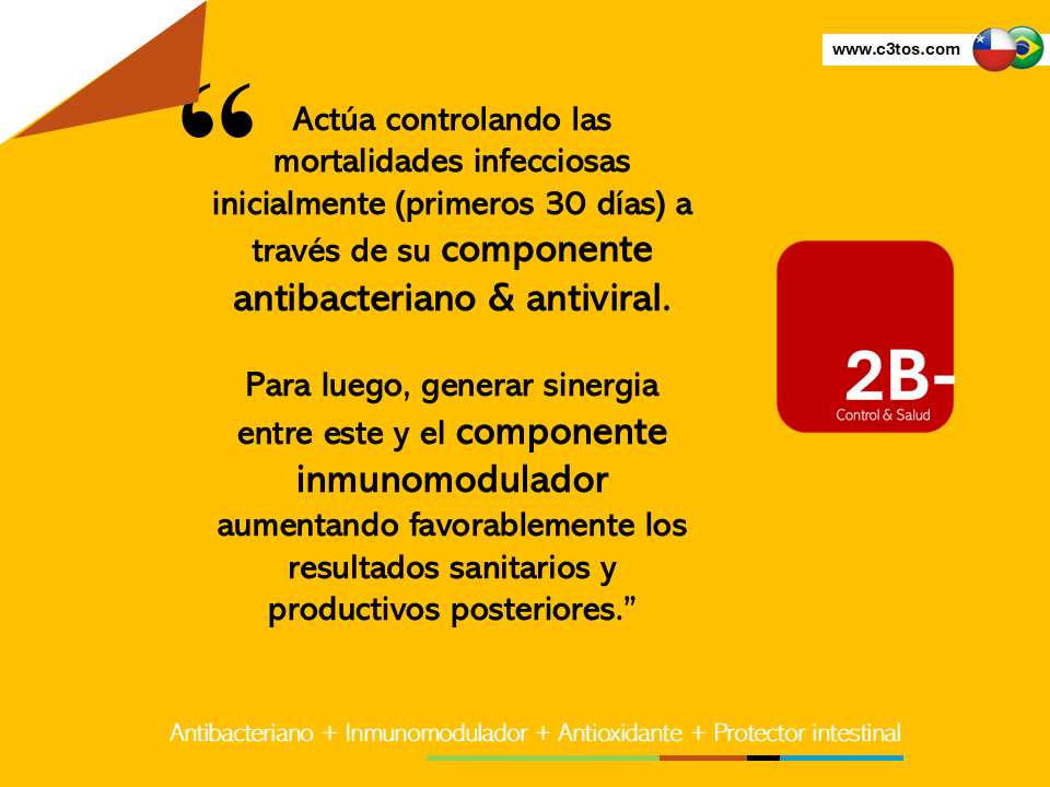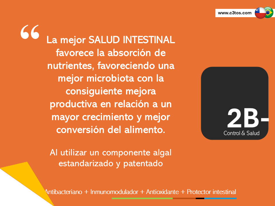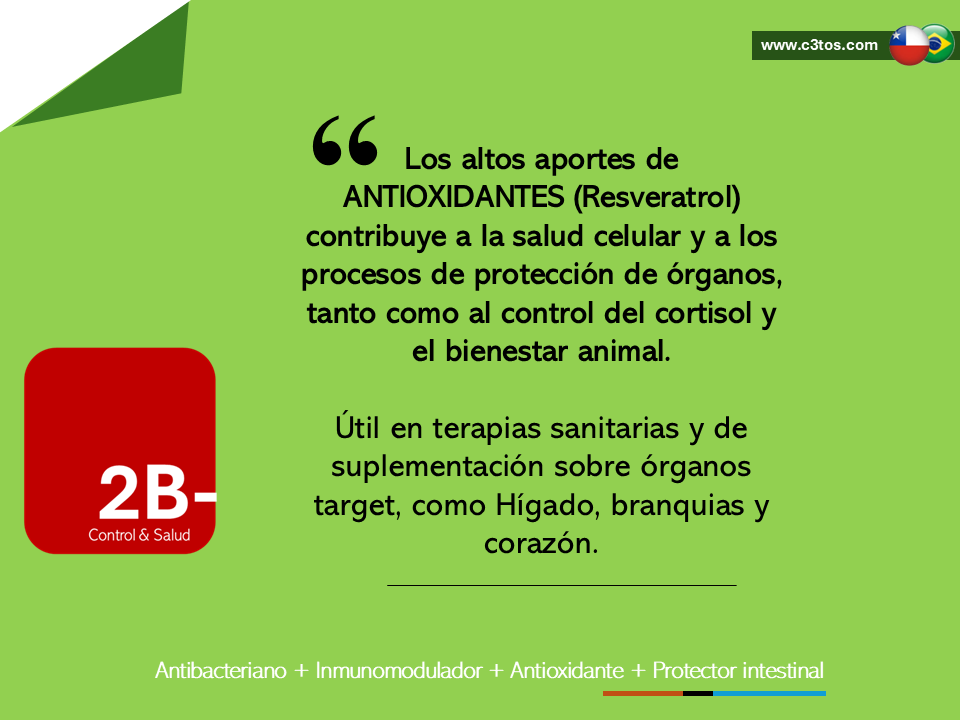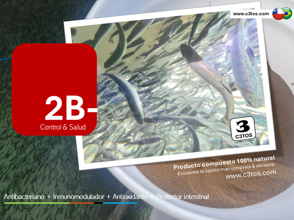 La formulación única de 2B-, es 100% natural a base de harinas estandarizadas. Logra que en un solo producto se unifiquen varios objetivos saludables, productivos y de gestión. Útil para todas las especies de peces de salmónidos y en cualquiera de las fases productivas (Útil en agua dulce y engorda)
