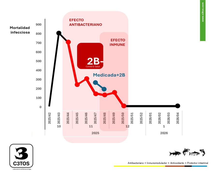 EL USO DE 2B- FAVORECE LA SOBREVIVENCIA DE LOS PECES, CON MENORES MORTALIDADES INFECCIOSAS, CON UNA MEJOR SALUD Y UN MAYOR CUIDADO DEL MEDIO AMBIENTE. REDUCE EL USO DE ANTIBIÓTICOS EN CUALQUIER ETAPA DEL CICLO PRODUCTIVO DE SALMONES & TILAPIAS