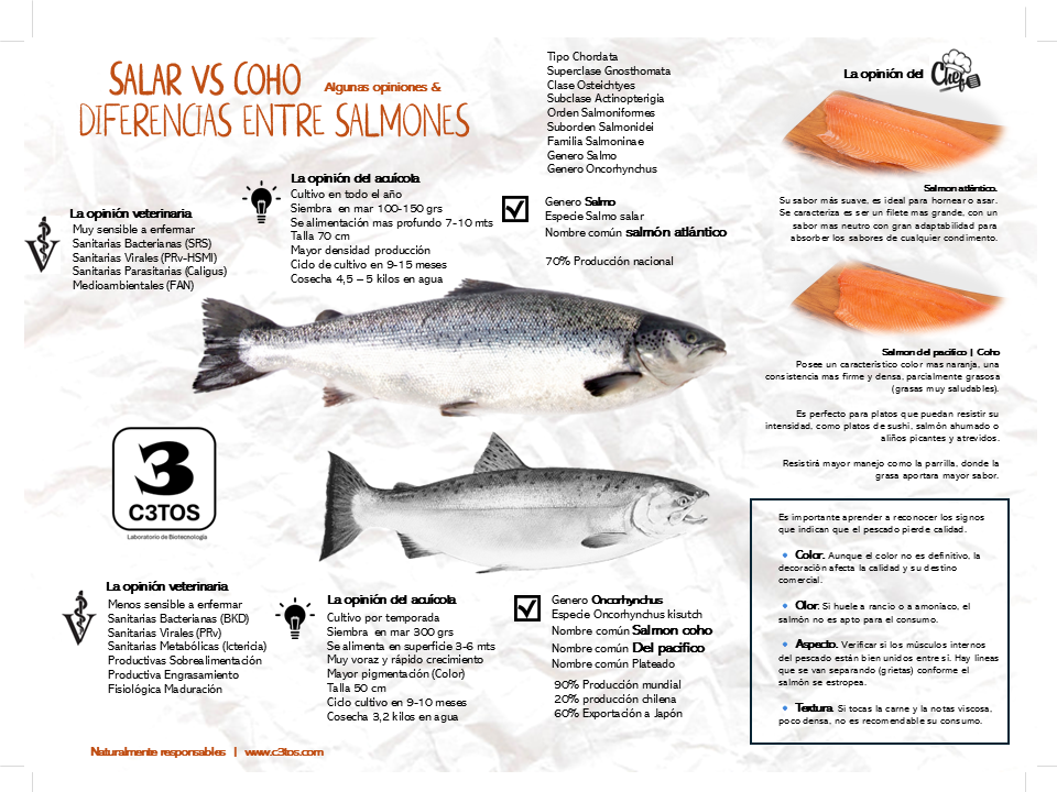 Cuales son las diferencias entre los dos mayores salmonidos que se cultivan en Chile. Desde el punto de vista de los productores, del área de salud y de un chef. Siempre es bueno conocer para poder diferenciarlas y aprovechar sus valiosas características.